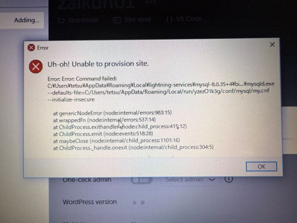 ③(2)LocalでWordPressサイトの新規作成中に以下のようなエラーメッセージが表示された場合、作業しているユーザーの名前が原因であることが多いです。以下の動画を参考に半角英数のみ(スペースや記号なし)のユーザーを追加し、そのユーザーに切り替えてもう一度インストール作業をやってみてください。